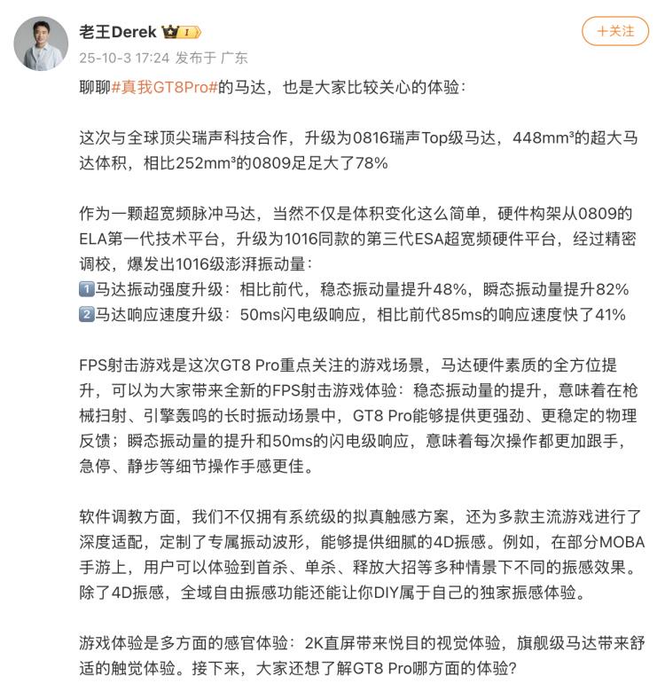 为了做到更好的电竞手感,真我还与瑞声科技合作,为GT8 Pro升级0816马达,在面积上相比上一代0809的252mm³大了78%,达到448mm³,并针对FPS游戏等特定场景进行专项升级和适配,以满足游戏玩家的需求。