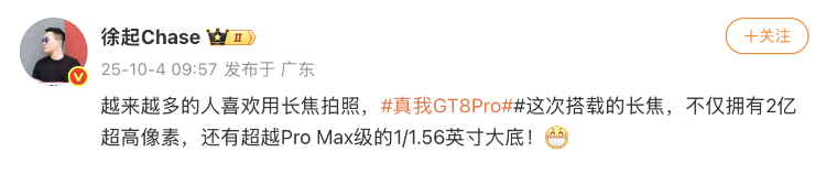 不止形态上创新,其影像实力也将迎来升级。10月4日,徐起表示真我GT8 Pro手机将搭载2亿超高像素长焦镜头,拥有“超越Pro Max级的1/1.56英寸大底”。