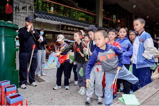 活动首站,孩子们沿鼓楼、登仙阁一路步行至南宋书房。沿途,带队老师娓娓道来南宋街巷的历史变迁,孩子们在行走中感受千年文脉的延续。在南宋书房,店长亲自为大家介绍这一复原宋代文人书斋的文化空间,从书桌、书架到典籍陈列,无不透出宋代“开卷有益”的雅致氛围。随后举行的“投壶比赛”更将气氛推向高潮,孩子们在传统游戏中体验古人的礼仪与趣味。