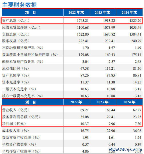 据民生金租2025年评级报告数据,2022年至2024年,该公司营业收入分别为69.21亿元、68.44亿元和62.27亿元,净利润分别为10.37亿元、7.96亿元和7.3亿元,整体业绩呈现出缓慢下滑趋势。